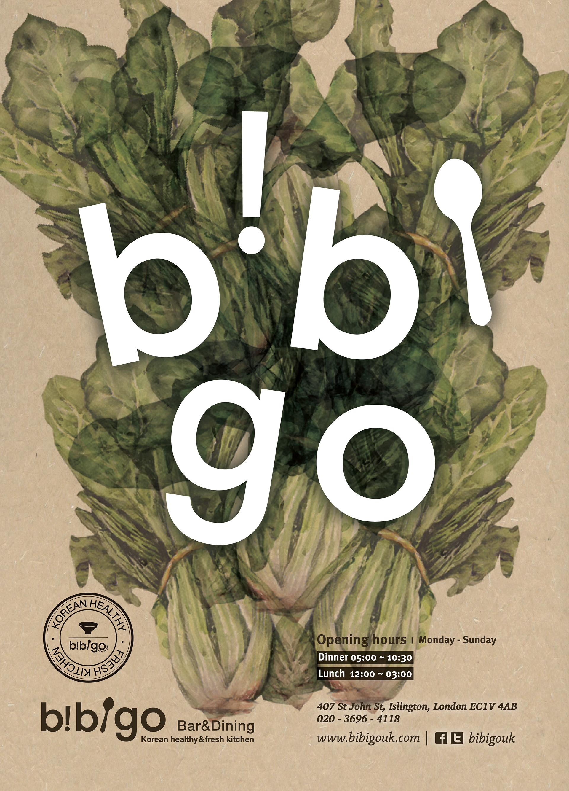 Bibigo London is a Korean restaurant that is a part of a large conglomerate firm, CJ Food Europe Ltd. The restaurant markets itself with the slogan “Healthy and fresh Korean kitchen”, so the marketing materials were designed to give an impression of well-being and freshness. The materials I designed include various brochures, signboards, vouchers, cloakroom cards and seasonal menus.