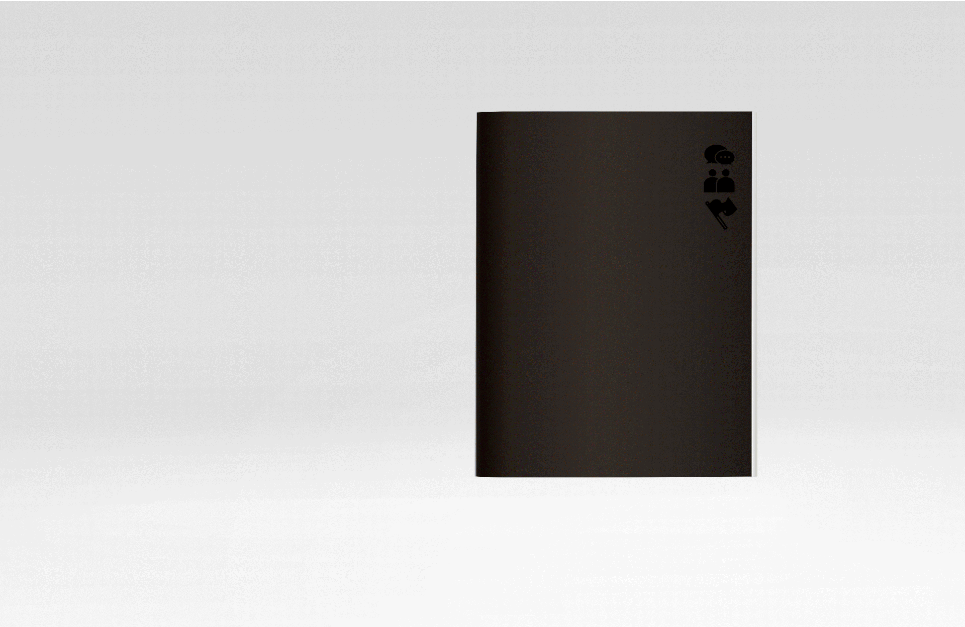 On the front cover, the three icons represent the subject of the project, ‘Language, Audience and Environment’, and the matching text descriptions have been placed on the back cover. The icons and texts are in registration black (C100 M100 Y100 K100) and the background is standard black (C0, M0, Y0, K100), overprinted. With those very slight differences in colour, I tried to express the vagueness of the definition of ‘language’. When you open the booklet, you will see the title with the icon in white, introducing you to a clearer idea of what ‘language’ might mean.